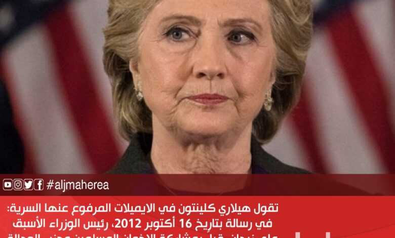 تقول هيلاري كلينتون في الايميلات المرفوع عنها السرية: في رسالة بتاريخ 16 أكتوبر 2012، رئيس الوزراء الأسبق علي زيدان، قبلَ بمشاركة الإخوان المسلمين وحزب العدالة والبناء في حكومته وبالتواصل مع عبدالحكيم بلحاج بينما كانت إدارة الرئيس الإخواني المصري (المعزول لاحقًا) محمد مرسي تضغط مع المقريف للعمل في مجال النفط في ليبيا بدل الشركات الغربية.