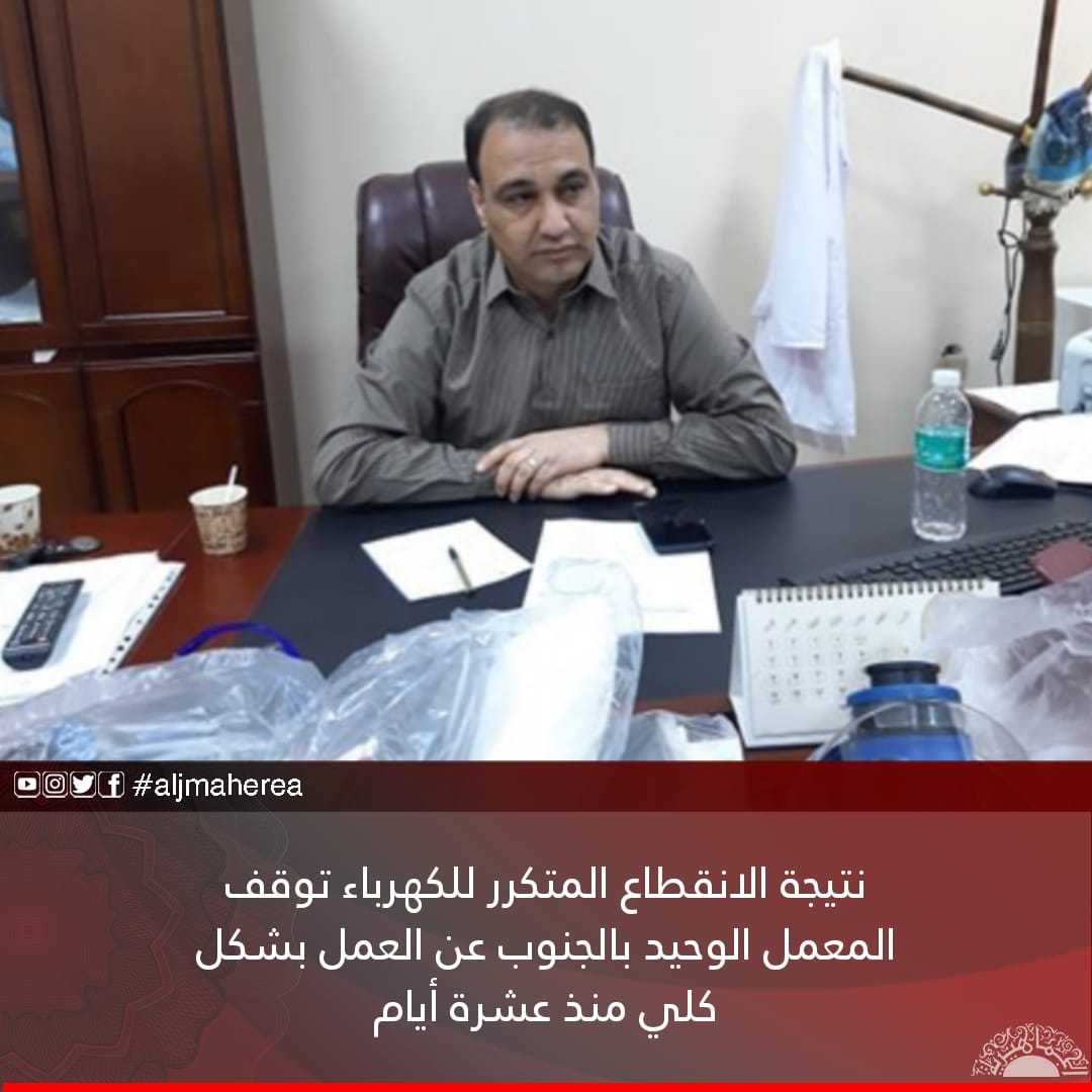 نتيجة الانقطاع المتكرر للكهرباء توقف المعمل الوحيد بالجنوب عن العمل بشكل كلي منذ عشرة أيام