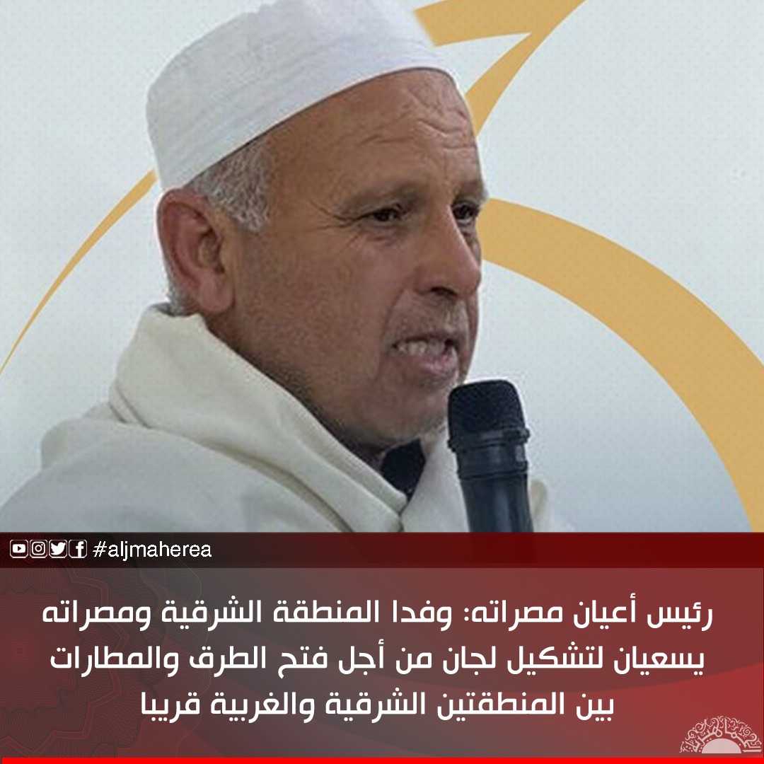 رئيس أعيان مصراته: وفدا المنطقة الشرقية ومصراته يسعيان لتشكيل لجان من أجل فتح الطرق والمطارات بين المنطقتين الشرقية والغربية قريبا