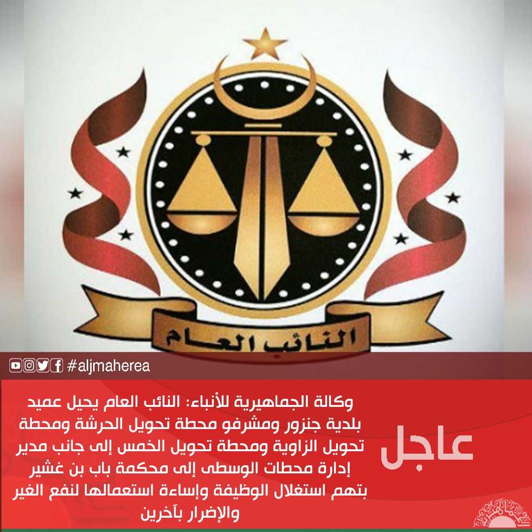 عاجل// وكالة الجماهيرية للأنباء: النائب العام يحيل عميد بلدية جنزور ومشرفو محطة تحويل الحرشة ومحطة تحويل الزاوية ومحطة تحويل الخمس إلى جانب مدير إدارة محطات الوسطى إلى محكمة باب بن غشير بتهم استغلال الوظيفة وإساءة استعمالها لنفع الغير والإضرار بآخرين