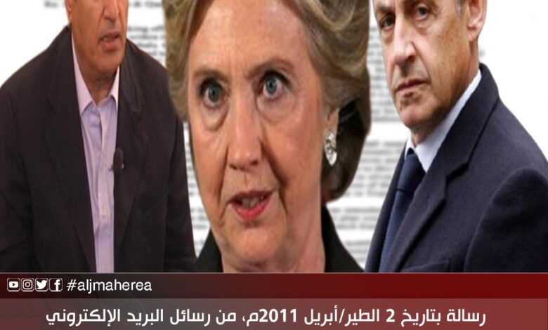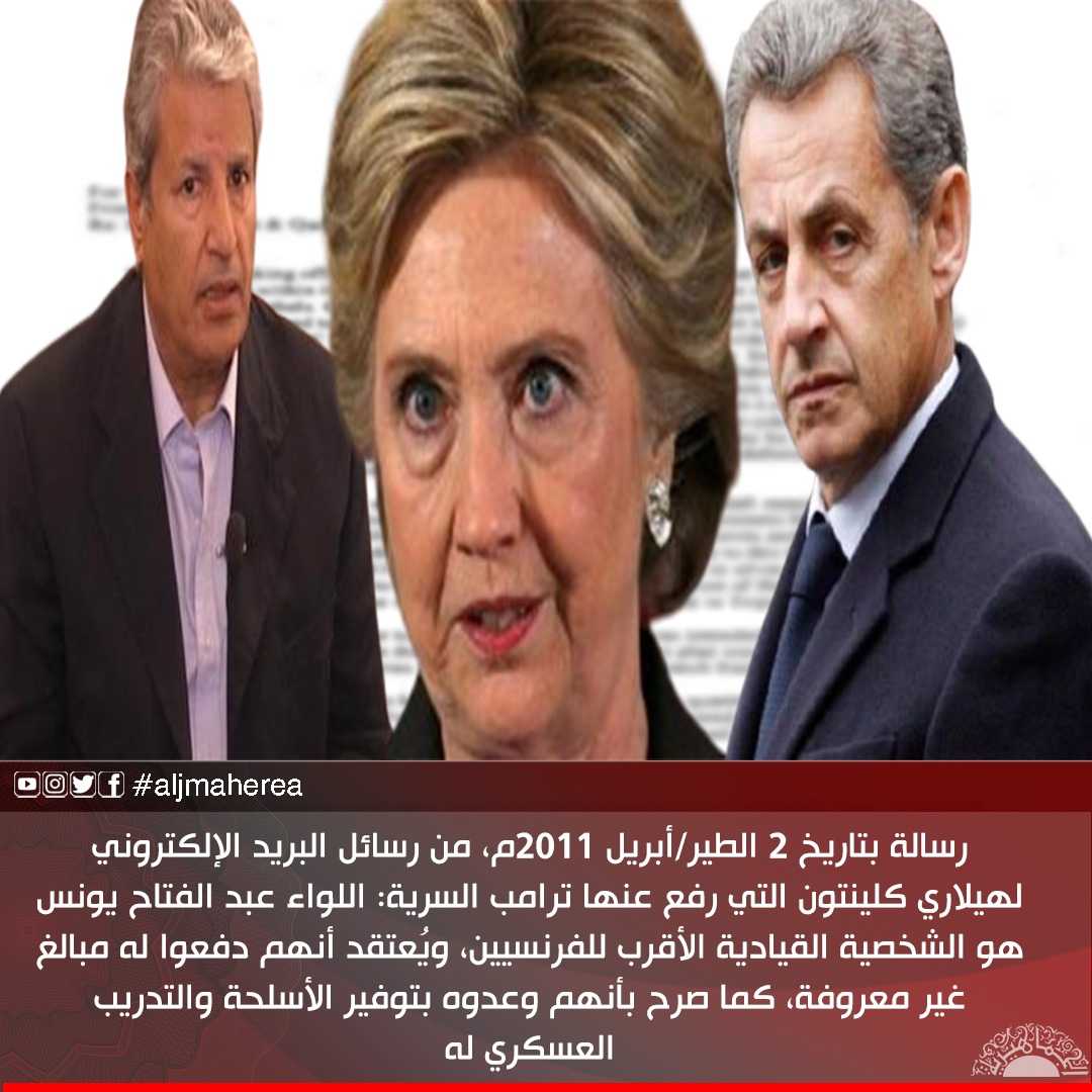 رسالة بتاريخ 2 الطير/أبريل 2011م، من رسائل البريد الإلكتروني لهيلاري كلينتون التي رفع عنها ترامب السرية: اللواء عبد الفتاح يونس هو الشخصية القيادية الأقرب للفرنسيين، ويُعتقد أنهم دفعوا له مبالغ غير معروفة، كما صرح بأنهم وعدوه بتوفير الأسلحة والتدريب العسكري له