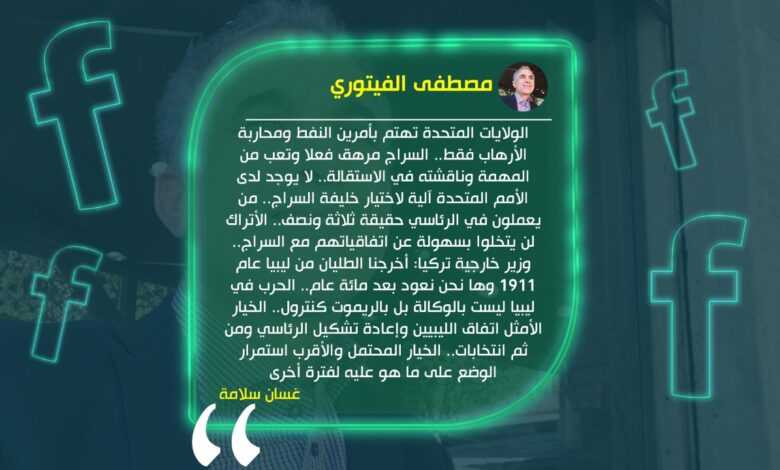 وأوضح الفيتوري، أنه تابع لقاءًا مع غسان سلامة عبر الأنترنت نظمه مركز كارنيغي الأمريكي للدراسات بعنوان”ليبيا في فوضى النظام العالمي الجديد”، وقال خلاله عن علاقة الولايات المتحدة بليبيا إن الولايات المتحدة تهتم بأمرين النفط ومحاربة الأرهاب فقط لا غير!