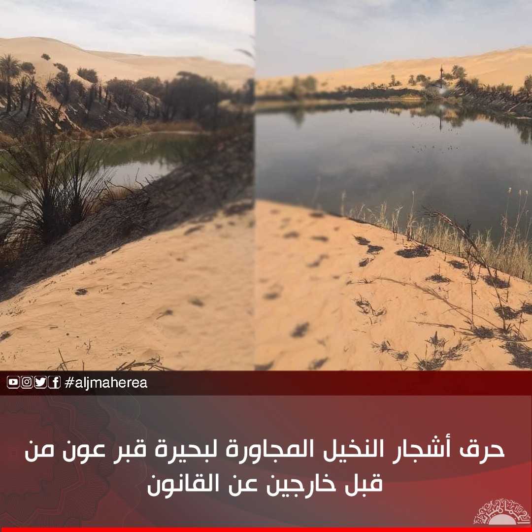 أظهرت صورا متداولة على مواقع التواصل الاجتماعي، قيام خارجين عن القانون، وفي ظل حالة الانفلات الأمني في مختلف ربوع ليبيا، بحرق أشجار النخيل المجاورة لبحيرة قبر عون.
