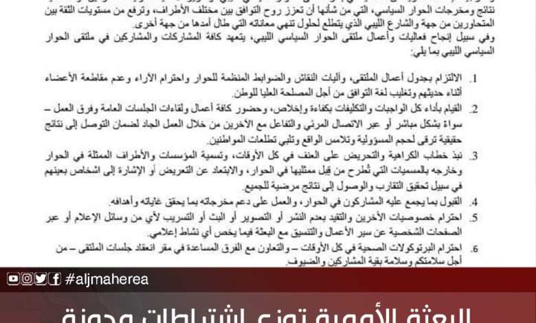 أظهرت ما سميت، بمدونة السلوك والتي تم توزيعها على الحضور في ملتقى الحوار السياسي الليبي المرتقب في تونس اواخر الشهر الجاري، قبل ذهابهم من جانب البعثة الأممية الاممية للدعم في ليبيا، عن العديد من الاشتراطات من الاشتراطات التي وضعتها البعثة للمدعوين في مقدمتها:-