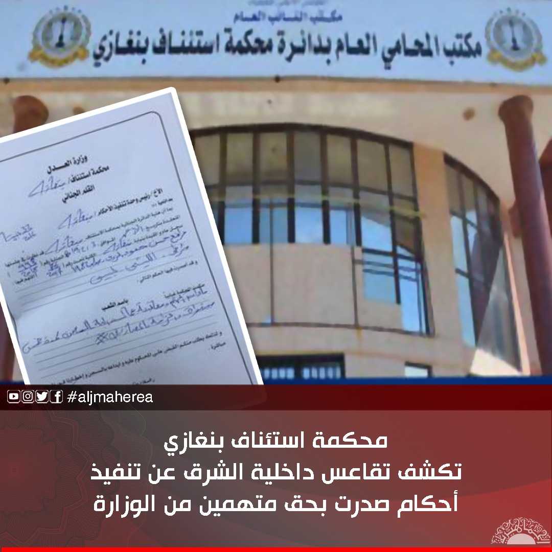 تقاعست وزارة الداخلية بحكومة الشرق عن تنفيذ أحكام قضائية صادرة عن محكمة استئناف بنغازي، بحق عدد من المجرمين الذين ينتمي بعضهم للوزارة.