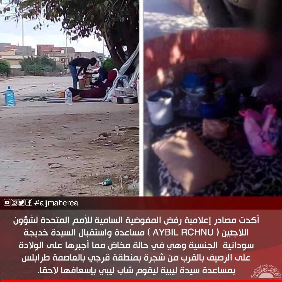 أكدت مصادر إعلامبة رفض المفوضية السامية للأمم المتحدة لشؤون اللاجئين ( UNHCR LIBYA ) مساعدة واستقبال السيدة خديجة سودانية الجنسية وهي في حالة مخاض مما أجبرها على الولادة على الرصيف بالقرب من شجرة بمنطقة قرجي بالعاصمة طرابلس بمساعدة سيدة ليبية ليقوم شاب ليبي بإسعافها لاحقا