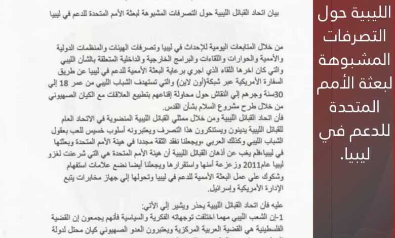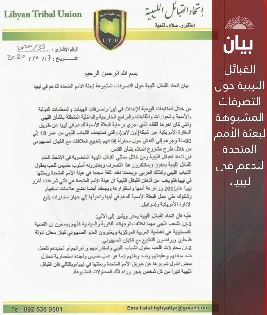 بيان أتحاد القبائل الليبية حول التصرفات المشبوهة لبعثة الأمم المتحدة للدعم في ليبيا.