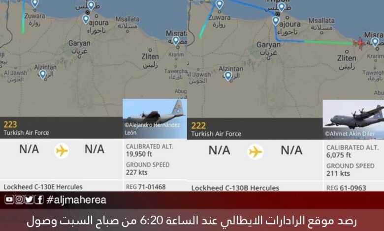 رصد موقع الرادارات الايطالي عند الساعة 6:20 من صباح السبت وصول طائرة شحن عسكرية برمز 222 من طراز لوكهيد C130 تابعة لسلاح الجو التركي قادمة من قاعدة قيصري في قونيا التركية متجهة إلي غرب ليبيا. كما رصد طائرة شحن عسكرية اخرى تحمل ترميز 223 من طراز اوكهيد C130 تابعة لسلاح الجو التركي اقلعت من الوطية اليوم