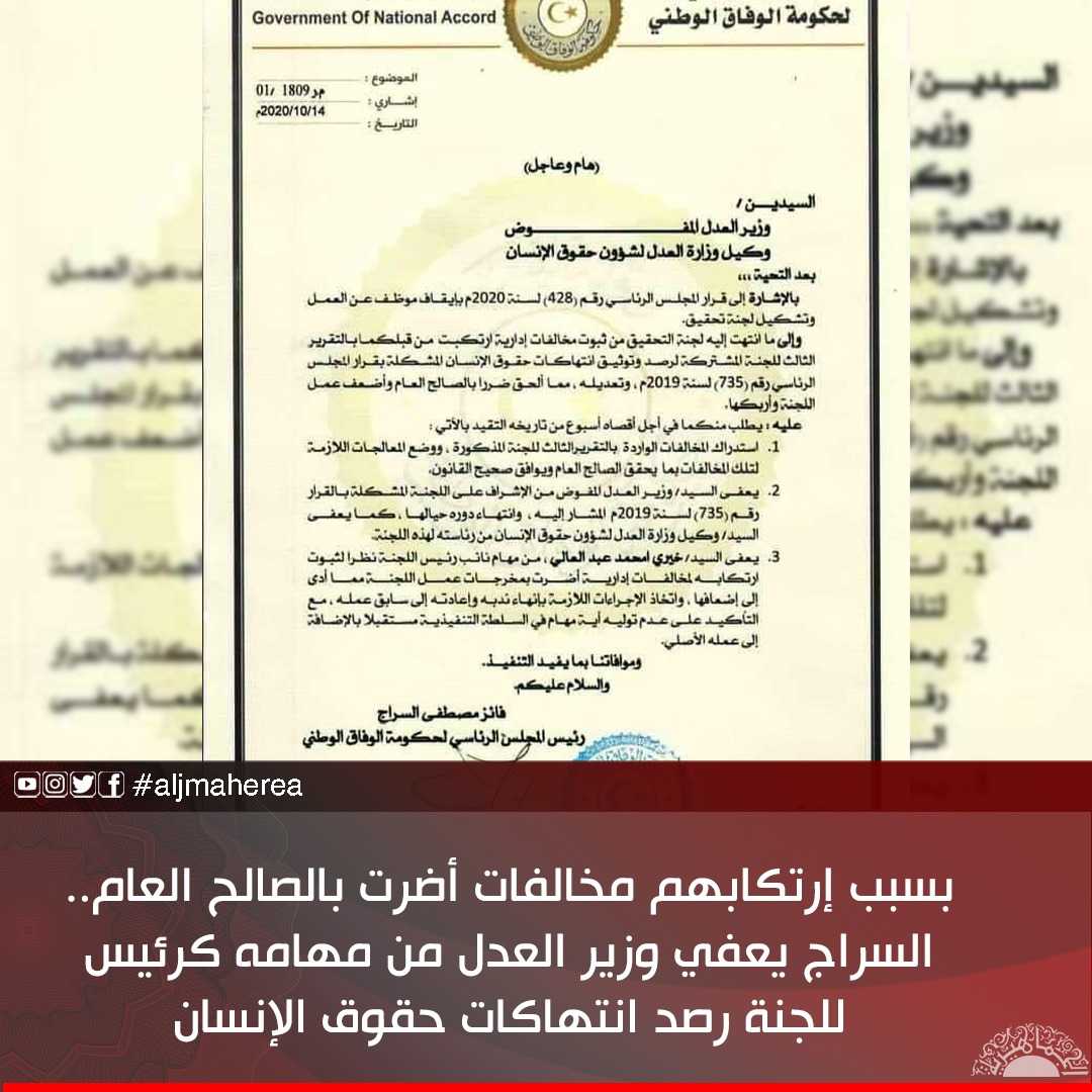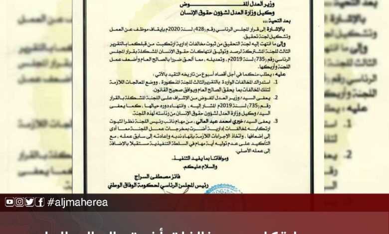أصدر رئيس المجلس الرئاسي غير الشرعي فايز السراج، قرارًا بإعفاء وزير العدل ووكيله لشؤون حقوق الإنسان من الإشراف على اللجنة المشتركة لرصد وتوثيق انتهاكات حقوق الإنسان، وذلك بدعوى ارتكابهم لمخالفات إدارية أضرت بمخرجات عمل اللجنة.