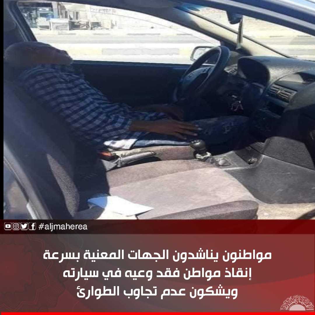مواطنون يناشدون الجهات المعنية بسرعة إنقاذ مواطن فقد وعيه في سيارته ويشكون عدم تجاوب الطوارئ