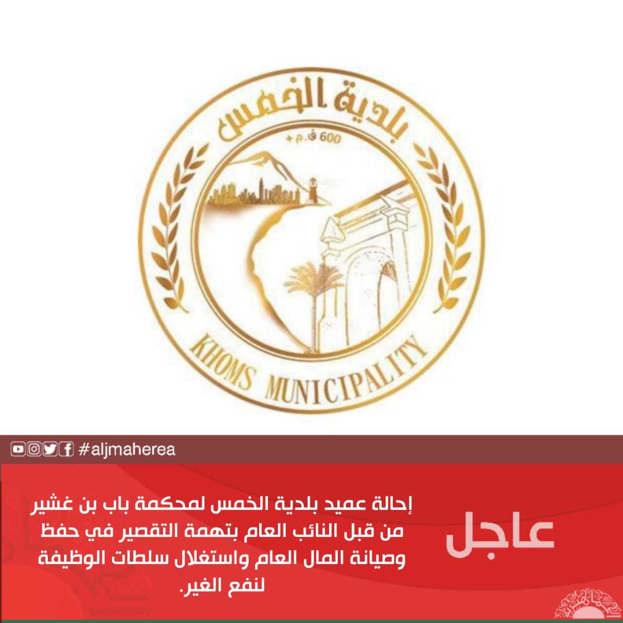 عاجل // إحالة عميد بلدية الخمس لمحكمة باب بن غشير من قبل النائب العام بتهمة التقصير في حفظ وصيانة المال العام واستغلال سلطات الوظيفة لنفع الغير