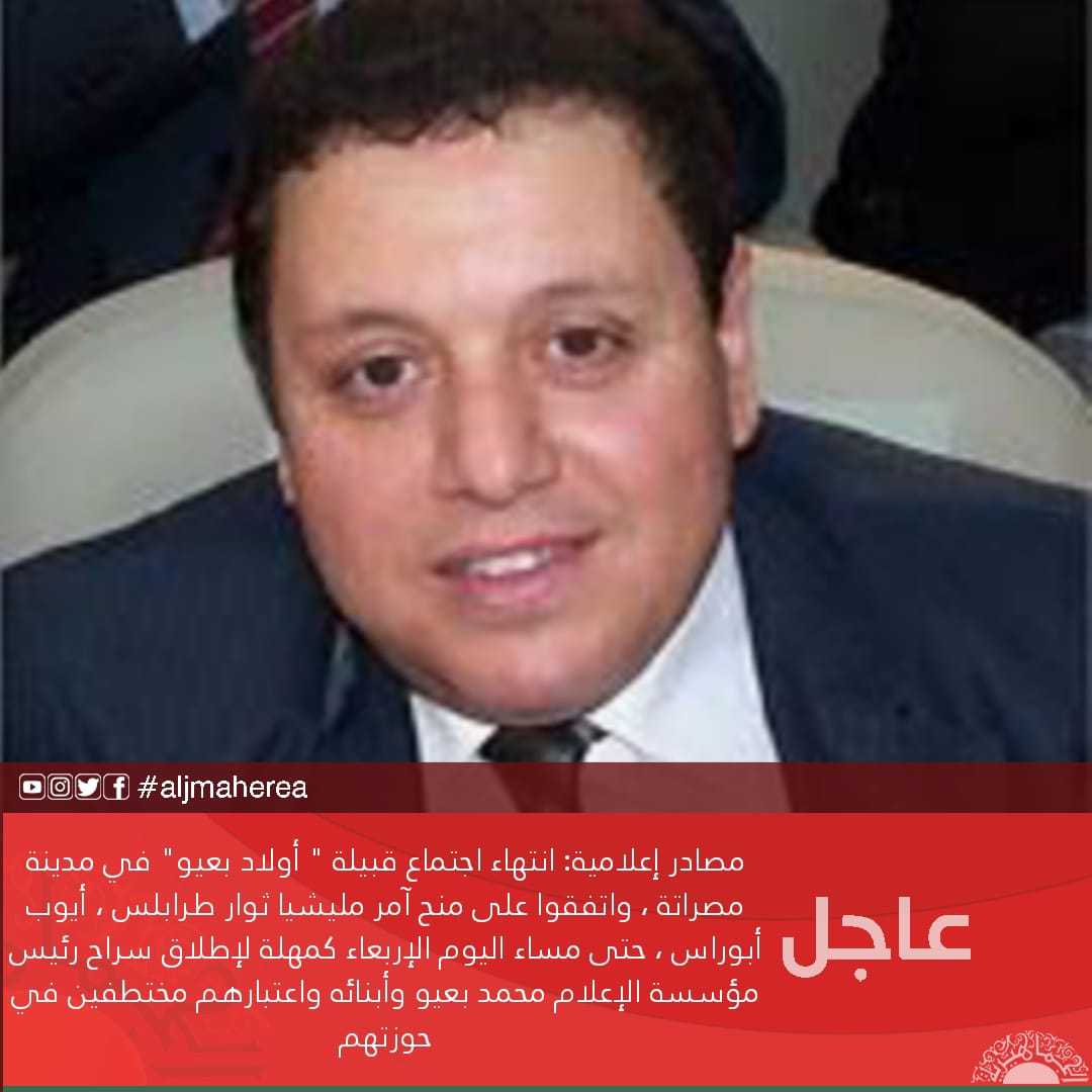 مصادر إعلامية: انتهاء اجتماع قبيلة ” أولاد بعيو” في مدينة مصراتة ، واتفقوا على منح آمر مليشيا ثوار طرابلس ، أيوب أبوراس ، حتى مساء اليوم الإربعاء كمهلة لإطلاق سراح رئيس مؤسسة الإعلام محمد بعيو وأبنائه واعتبارهم مختطفين في حوزتهم