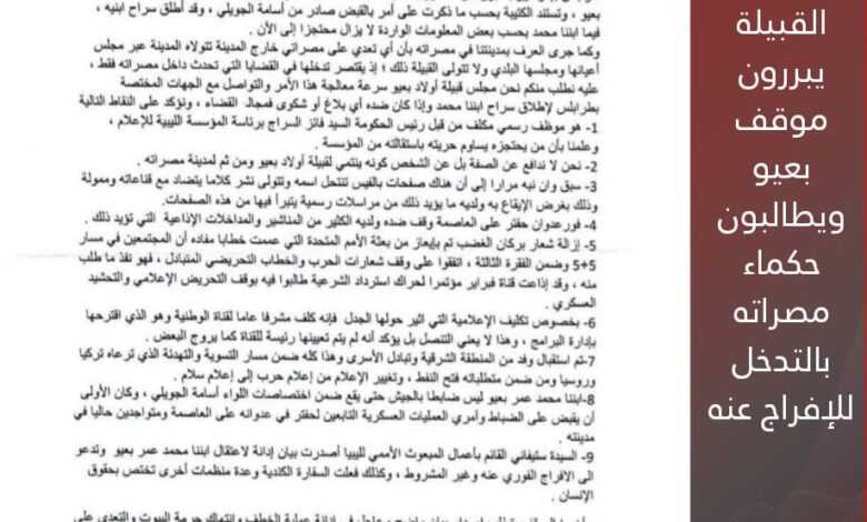 وتضمنت التوضيحات الواردة في الشكوى أن بعيو موظف رسمي من قبل المجلس الرئاسي غير الشرعي ويحتجز ويتم المساومة على حريته بتقديم استقالته، مؤكدة (التوضيحات) أن مجلس القبيلة لا يدافع عن الصفة بل عن الشخص كونه ينتمي لقبيلة أولاد بعيو ومن ثم لمدينة مصراته.