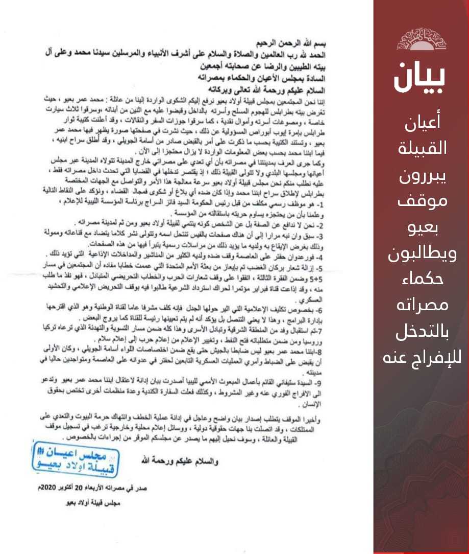 رفع مجلس أعيان قبيلة أولاد بعيو شكوى لمجلس أعياء وحكماء مصراته، تضمن عددا من نقاط التوضيح التي انتهت إلى إصدار بيان عاجل في إدانة عملية الخطف وانتهاك حرمة البيوت والتعدي على الممتلكات.