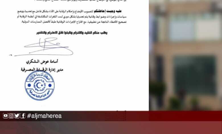 وطالب مدير إدارة الرقابة المالية بالمصرف، أسامة الشكري، في خطاب إلى مديري عموم ومديري فروع تلك المصارف، المصارف بتطبيق سياسة الضبط الداخلي والرقابة الداخلية وضبط المخاطر التشغيلية.