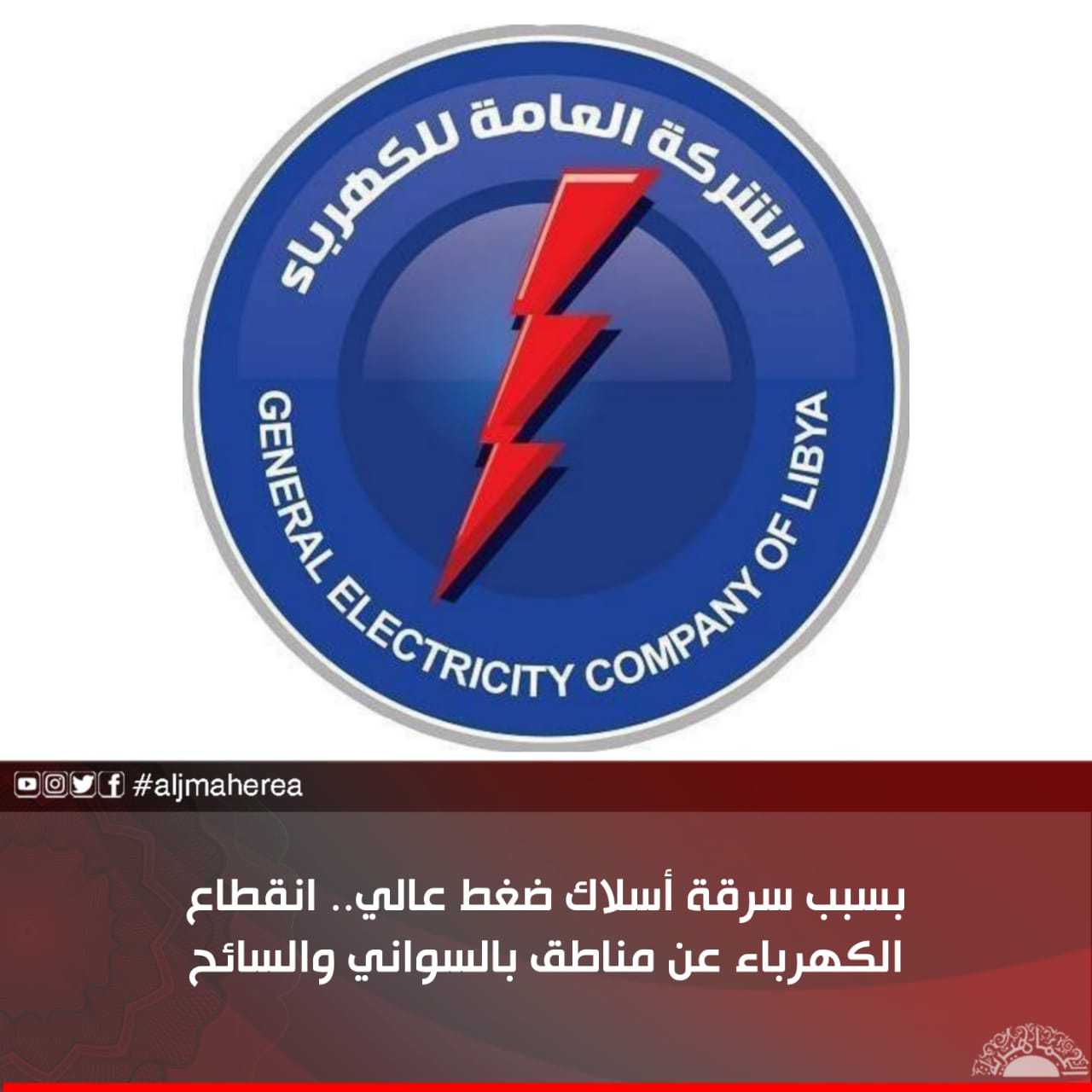أعلنت الشركة العامة للكهرباء عن سرقة أسلاك ضغط عالي مسافة 450متر على خط إنجيلة من فرعية البستان بدائرة السواني بإدارة توزيع الجفارة، ما أدى إلى فقد التغذية عن محول وانقطاع الكهرباء على عدد من المنازل.