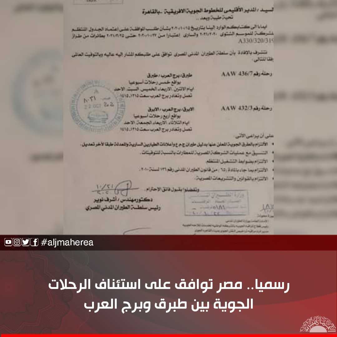وافقت سلطة الطيران المدني في مصر، على استئناف الرحلات الجوية بين كل من طبرق/ برج العرب/ طبرق، بواقع خمس رحلات أسبوعيا، أيام الاثنين والأربعاء والخميس والسبت والأحد، ومن الأبرق/برج العرب/ الأبرق بواقع أربع رحلات أسبوعيا، الثلاثاء والأربعاء والجمعة والأحد. على أن تبدا الرحلات يوم 27 أكتوبر الجاري.