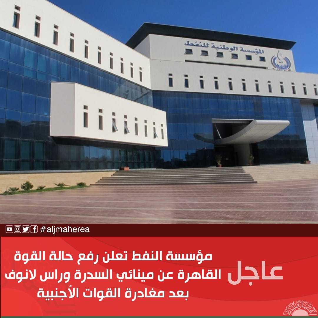 عاجل // مؤسسة النفط تعلن رفع حالة القوة القاهرة عن مينائي السدرة وراس لانوف بعد مغادرة القوات الأجنبية