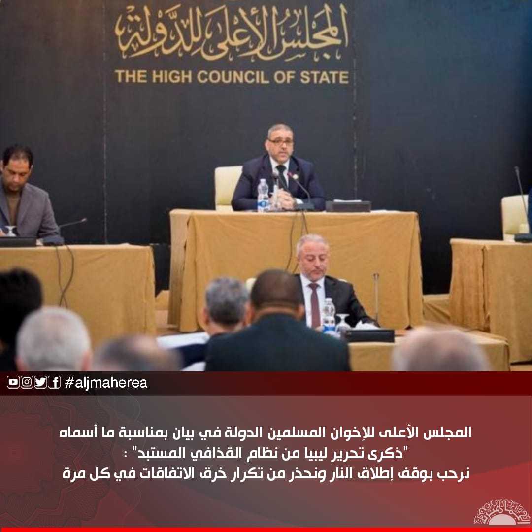 المجلس الأعلى للإخوان المسلمين الدولة في بيان بمناسبة ما أسماه “ذكرى تحرير ليبيا من نظام القذافي المستبد” : نرحب بوقف إطلاق النار ونحذر من تكرار خرق الاتفاقات في كل مرة