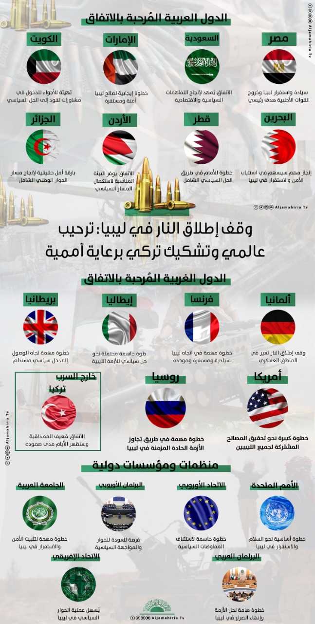 فور اعلان البعثة الأممية للدعم في ليبيا، أمس الجمعة، عن توقيع اتفاق لوقف دائم لإطلاق النار بين الفرقاء الليبيين، تعالت الأصوات المُرحبة بالاتفاق الذي ترعاه الأمم المتحدة فيما شككت دولة واحدة في مصداقية الاتفاق وهي تركيا.