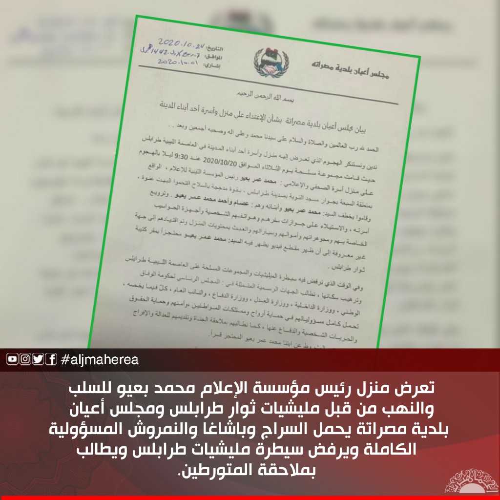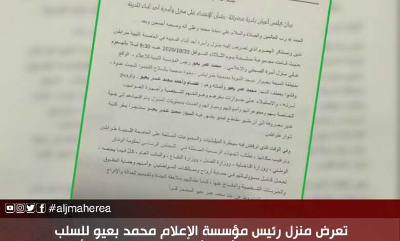 الرئيسية/محلي/تعرض منزل رئيس مؤسسة الإعلام محمد بعيو للسلب والنهب من قبل مليشيات ثوار طرابلس ومجلس أعيان بلدية مصراتة يحمل السراج وباشاغا والنمروش المسؤولية الكاملة ويرفض سيطرة مليشيات طرابلس ويطالب بملاحقة المتورطين. محلي تعرض منزل رئيس مؤسسة الإعلام محمد بعيو للسلب والنهب من قبل مليشيات ثوار طرابلس ومجلس أعيان بلدية مصراتة يحمل السراج وباشاغا والنمروش المسؤولية الكاملة ويرفض سيطرة مليشيات طرابلس ويطالب بملاحقة المتورطين. 25 أكتوبر، 2020 الوسومليبيا مصراتة 25 أكتوبر، 2020 فيسبوك تويتر بينتيريست واتساب تيلقرام ڤايبر مشاركة عبر البريد طباعة