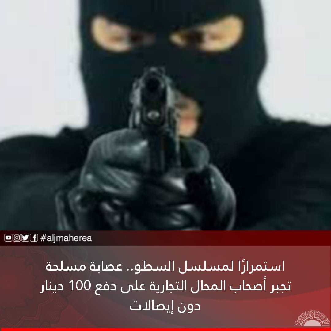 استمرارا لمسلسل السطو والنهب والسرقة في غياب الدولة ومؤسساتها الشرطية والأمنية.. عصابة مسلحة مكونة من أربعة أشخاص يهاجمون المحال التجارية في شارع الكنيسة، ويجبرون أصحابها على دفع 100 دينار دون إيصالات أو إثبات هوية.
