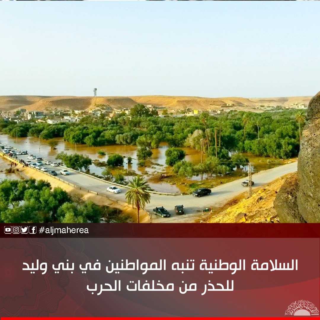 نبه مكتب هيئة السلامة الوطنية في بني وليد والوحدات التابعة له، اليوم الأحد، المواطنين في المزارع، إلى ضرورة أخذ الحيطة والحذر من مخلفات الحرب المتواجدة بالوادي بسبب سيلان الوادي في الفترة الماضية.