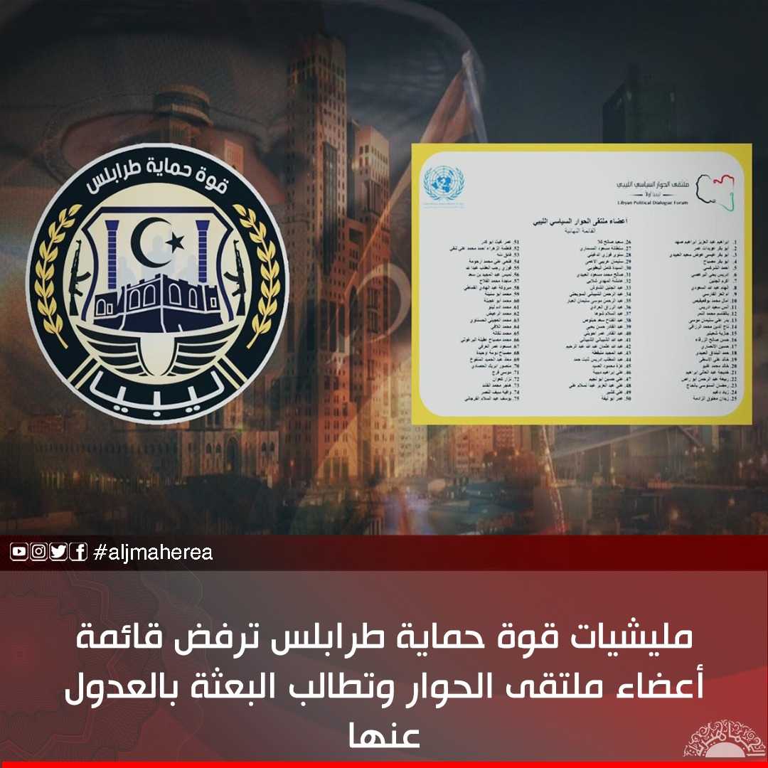 أعربت مليشيات قوة حماية طرابلس عن استغرابها من قائمة أعضاء ملتقى الحوار السياسي الليبي، مشيرة إلى أنها تحمل العديد من الأسماء الجدلية التي كانت سببا في خراب البلاد ومشعل الفتنة فيها.