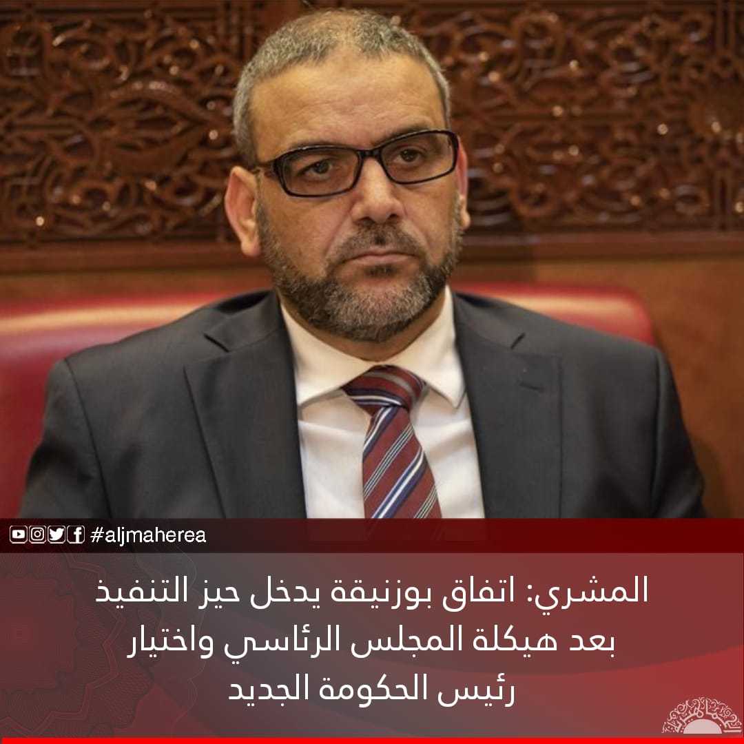 ولفت المشري، أن اتفاق بوزنيقة يدخل حيز التنفيذ بعد إعادة هيكلة المجلس الرئاسي وتشكيله من رئيس ونائبين واختيار رئيس حكومة موحد، ولا يعتد به إلا بعد عرضه على مجلس النواب، ومجلس الدولة.