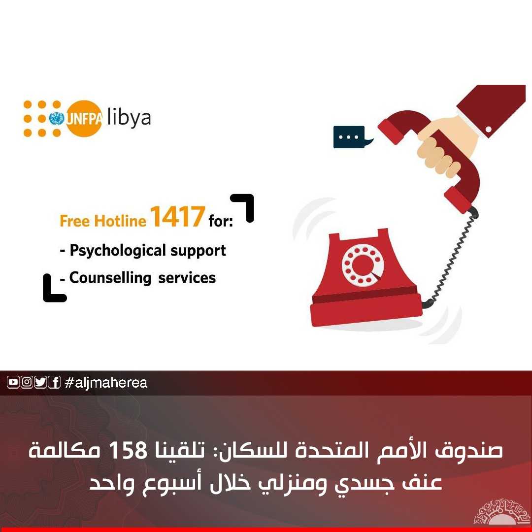 تلقى الخط الساخن 1417 للدعم النفسي الاجتماعي التابع لصندوق الأمم المتحدة للسكان في ليبيا، 158 مكالمة خلال الأسبوع الماضي فقط، تتعلق بقضايا العنف المنزلي والجسدي.