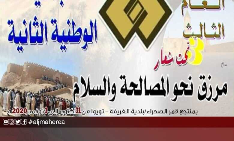 الملتقى ينعقد بمنتجع قمر الصحراء بتويوا ببلدية الغريفة تحت شعار ” مرزق نحو المصالحة والسلام ” .
