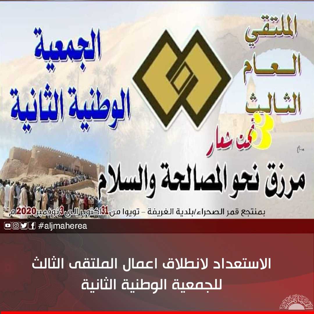 تحتضن مدينة مرزق بالجنوب الليبي اعمال الملتقى الثالث للجمعية الوطنية الثانية خلال الفترة من 31 التمور/ اكتوبر حتى 3 الحرث /نوفمبر 2020.