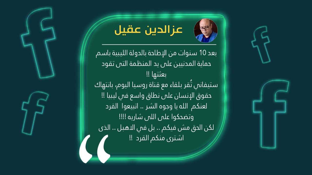 وقال عقيل ” بعد 10 سنوات من الإطاحة بالدولة الليبية باسم حماية المدنيين على يد المنظمة التى تقود بعثتها !!، ستيفاني تُقر بلقاء مع قناة روسيا اليوم، بانتهاك حقوق الإنسان على نطاق واسع في ليبيا !!”