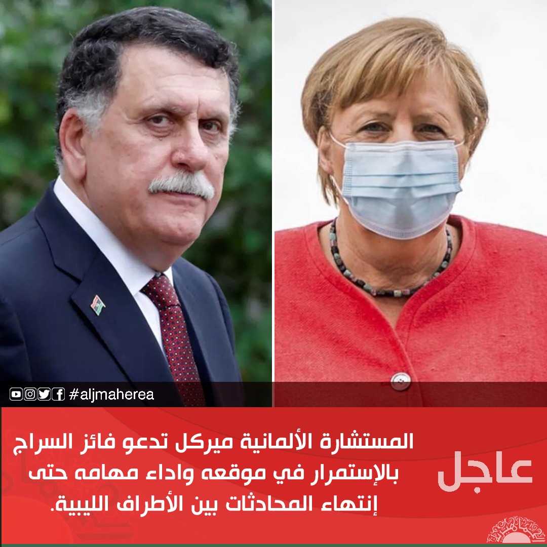 عاجل // المستشارة الألمانية ميركل تدعو فائز السراج بالإستمرار في موقعه واداء مهامه حتى إنتهاء المحادثات بين الأطراف الليبية