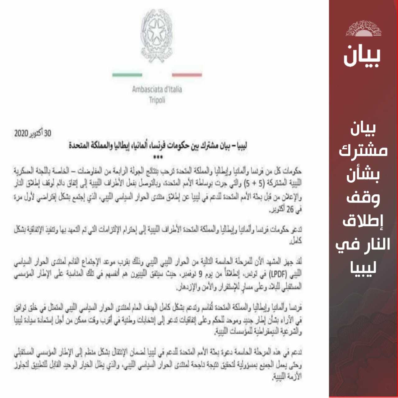دعت حكومات فرنسا وألمانيا وإيطاليا والمملكة المتحدة في بيان مشترك الأطراف الليبية إلى الالتزام بتعهداتها وتطبيق اتفاق وقف اطلاق النار .