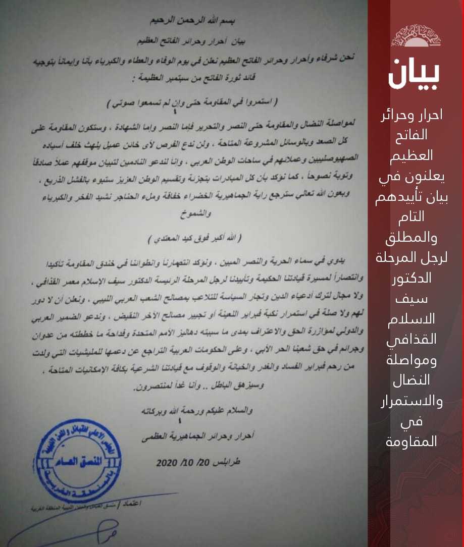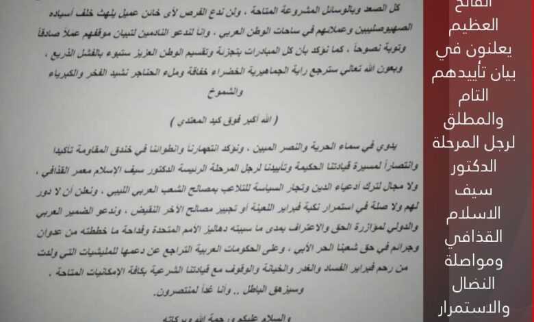 احرار وحرائر الفاتح العظيم يعلنون في بيان تأييدهم التام والمطلق لرجل المرحلة الدكتور سيف الاسلام القذافي ومواصلة النضال والاستمرار في المقاومة