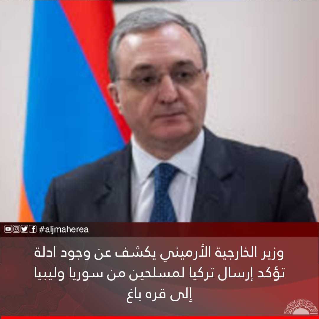 وقال وزير الخارجية الأرميني في مقابلة مع وكالة “سبوتنيك” الروسية الخميس :”هناك أدلة دامغة لاجدال فيها على استمرار إرسال تركيا لمقاتلين إرهابيين أجانب من سوريا وليبيا إلى قره باغ”.