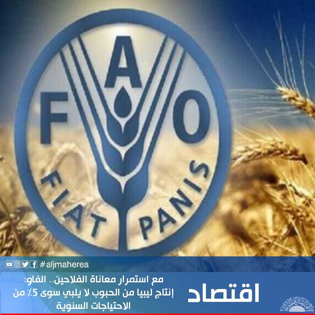 أعلنت منظمة الأغذية والزراعة التابعة للأمم المتحدة «فاو» إن إنتاج الحبوب محلياً في ليبيا لا يلبي سوى 5 % من الاحتياجات السنوية، مشيرة إلى ارتفاع تكلفة سلة غذاء الحد الأدنى من الإنفاق، التي تلبي الاحتياجات الأساسية بنسبة 20 %.