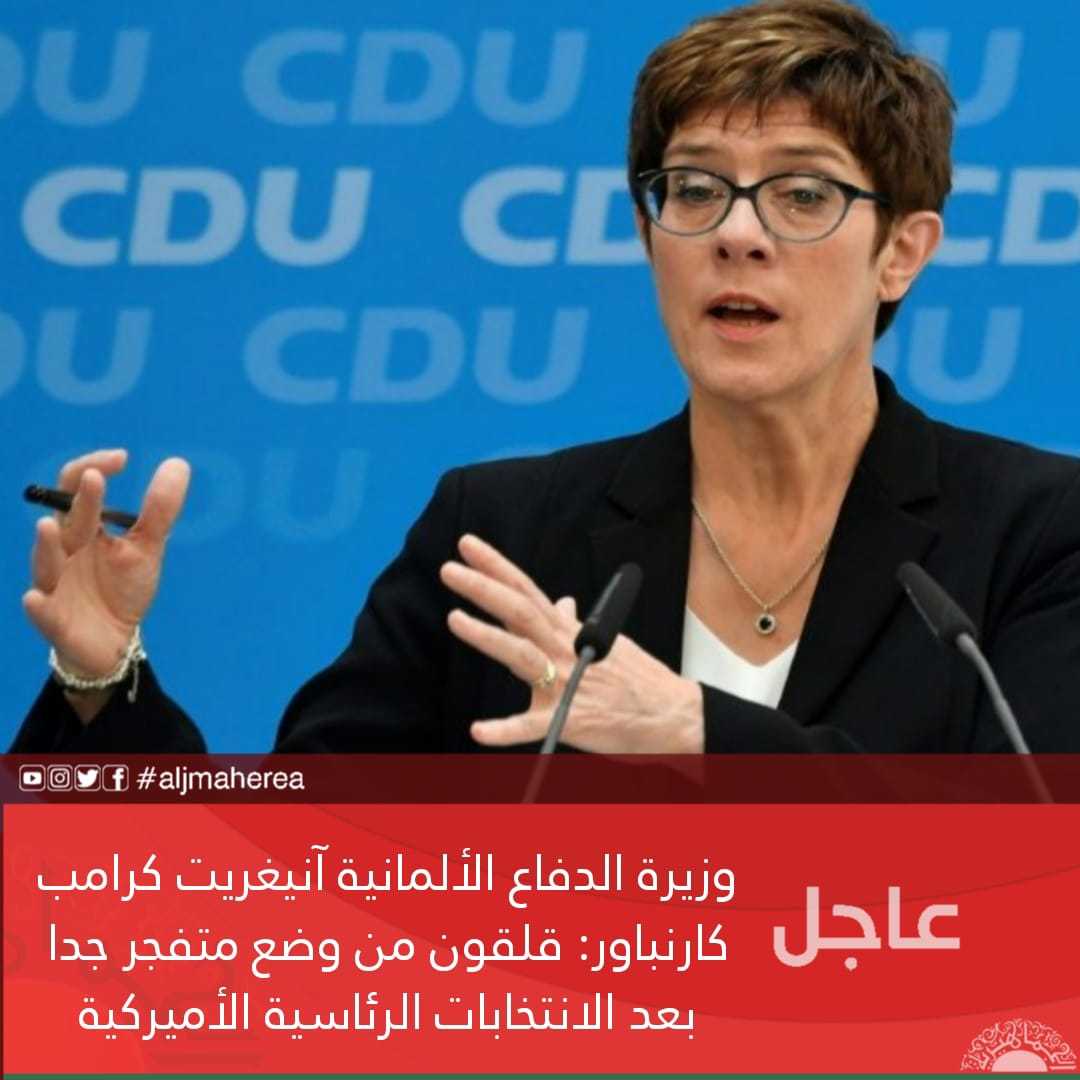 عاجل// وزيرة الدفاع الألمانية آنيغريت كرامب كارنباور: قلقون من وضع متفجر جدا بعد الانتخابات الرئاسية الأميركية 5 سنوات ago عاجل// وزيرة الدفاع الألمانية آنيغريت كرامب كارنباور: قلقون من وضع متفجر جدا بعد الانتخابات الرئاسية الأميركية مقالات ذات صلة الجنائية الدولية تُحمّل إيطاليا مسؤولية الإفراج عن نجيم وتسليمه لليبيا رغم مذكرة التوقيف عاجل| بريطانيا وفرنسا وكندا تهدد إسرائيل بإجراءات ملموسة إذا واصلت حربها بغزة أميركا تصادر طائرة الرئيس الفنزويلي وتنقلها إلى فلوريدا