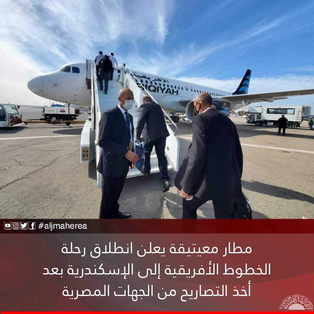 بعد تردد أنباء عن تأجيلها عن الموعد الذي كان محددا اليوم، لعدم صدور التصاريح المصرية من جهة الطيران المدني المصري لاستقبالها، أعلنت إدارة مطار معيتيقة، أن ركاب الطائرة المتجهة إلى مطار برج العرب بمدينة الإسكندرية المصرية، باشروا الصعود على متن رحلة الخطوط الجوية الأفريقية.