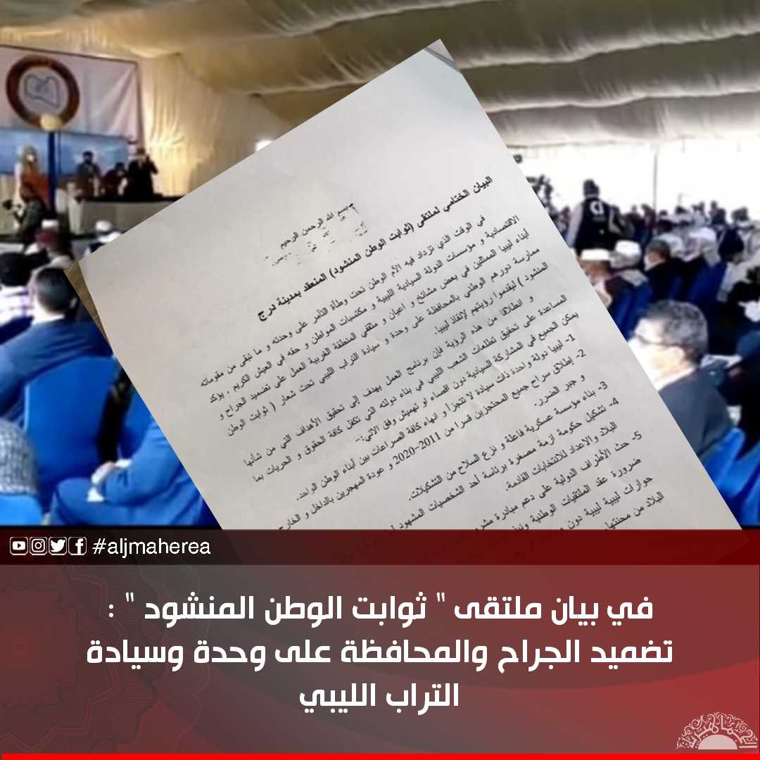 في بيان ملتقى ” ثوابت الوطن المنشود ” : تضميد الجراح والمحافظة على وحدة وسيادة التراب الليبي