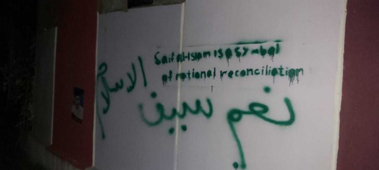 فيما تداولت مواقع ليبية صورًا في المدرسة نفسها مصحوبة بعبارات ” نعم سيف الإسلام”