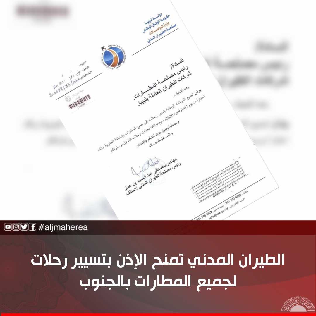 وأكد بن عمار في خطاب وجهه إلى رئيس مصلحة المطارات، وشركات الطيران العاملة في ليبيا، بضرورة موافاتهم بجداول رحلات التشغيل.