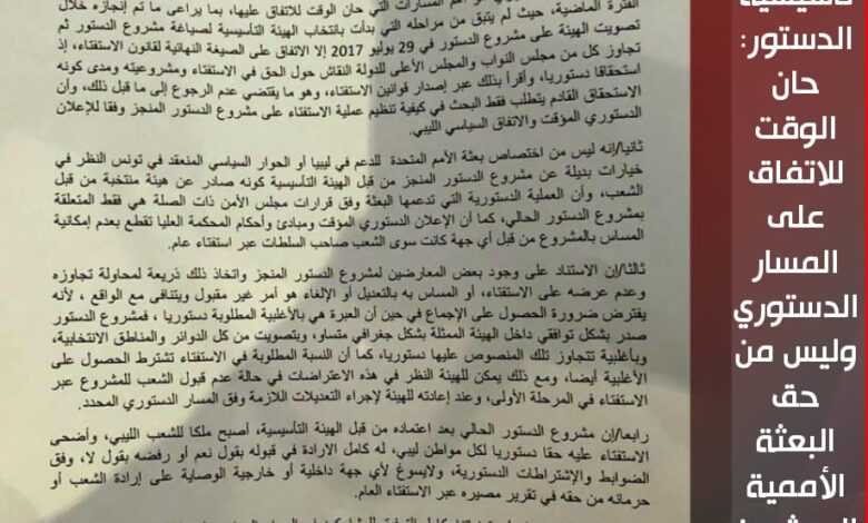 كما أشار الأعضاء في بيان لهم حول مناقشات المسار الدستوري باجتماعات الحوار السياسي الشامل المزمع عقده بتونس، إلى أنه ليس من اختصاص بعثة الأمم المتحدة للدعم في ليبيا أو الحوار السياسي المنعقد في تونس النظر في خيارات بديلة عن مشروع الدستور المنجز من قبل الهيئة التأسيسية كونه صادر عن هيئة منتخبة من قبل الشعب، وأن العملية الدستورية التي تدعمها البعثة وفق قرارات مجلس الأمن ذات الصلة هي فقط المتعلقة بمشروع الدستور الحالي، كما أن الإعلان الدستوري المؤقت ومبادئ وأحكان المحكمة العليا تقطع بعدم إمكانية المساس بالمشروع من قبل أي جهة كانت سوى الشعب صاحب السلطات عبر استفتاء عام.