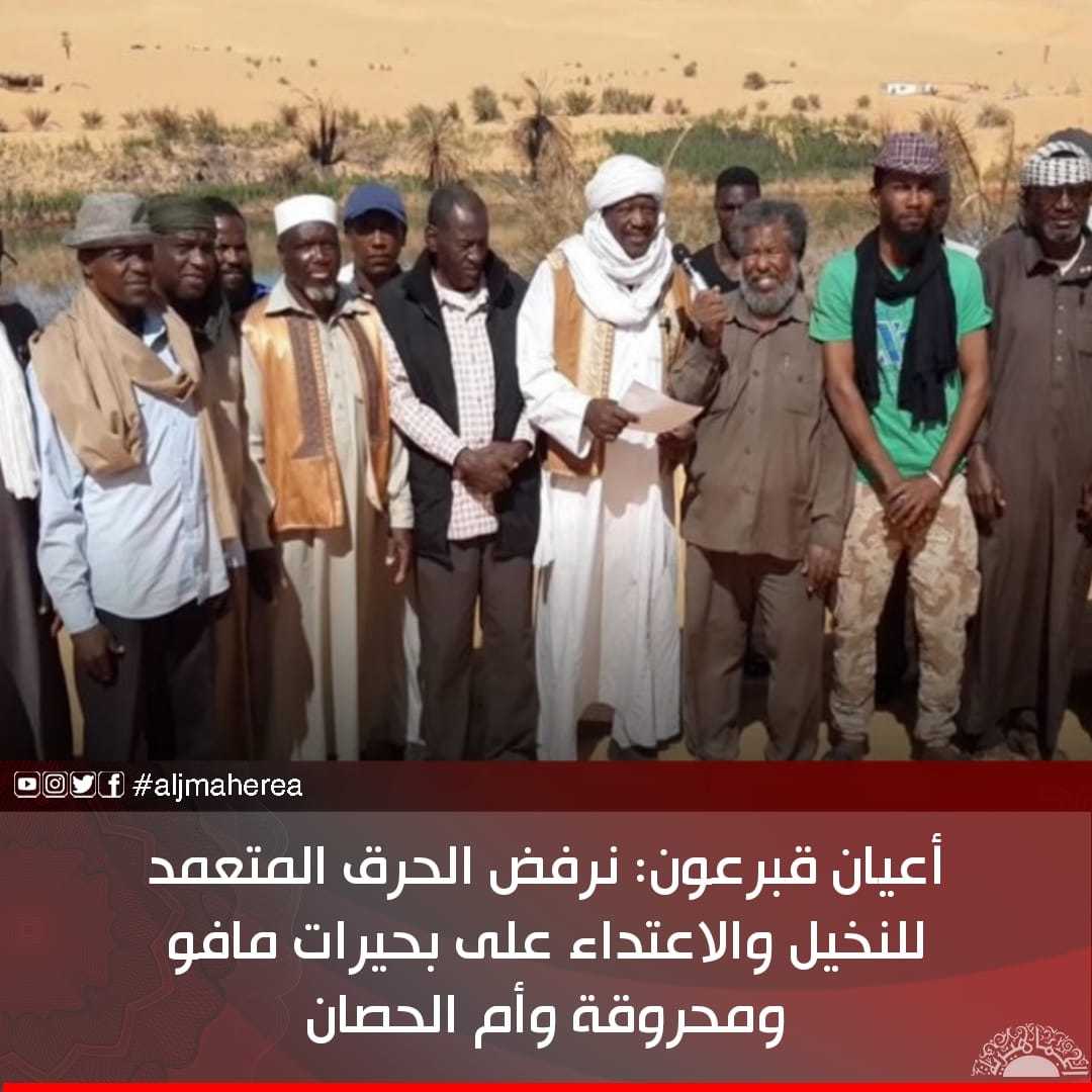 وأضافوا وفق البيان: نحن قبائل قبرعون ومجارحة وورفلة وطوارق توجد لنا أشجار نخيل توراثناها من أجدادنا؛ حيث لا نمانع من زيارة هذه المناطق للسياحة وللترفيه ولا للخراب والدمار.