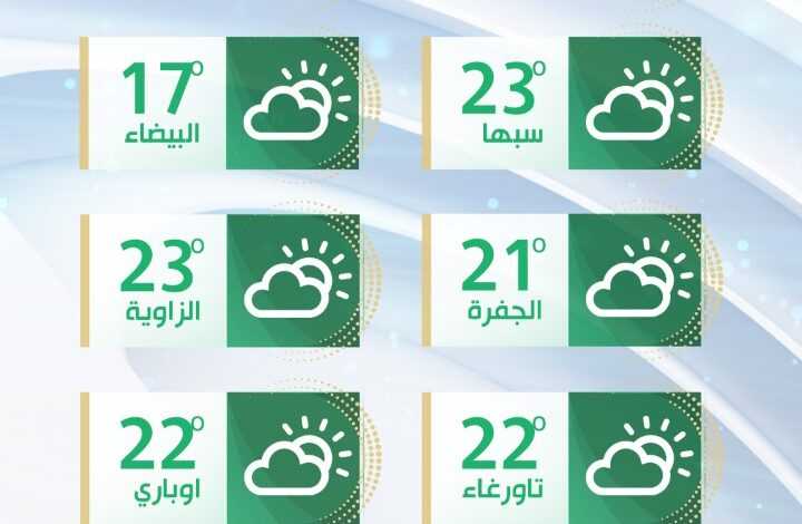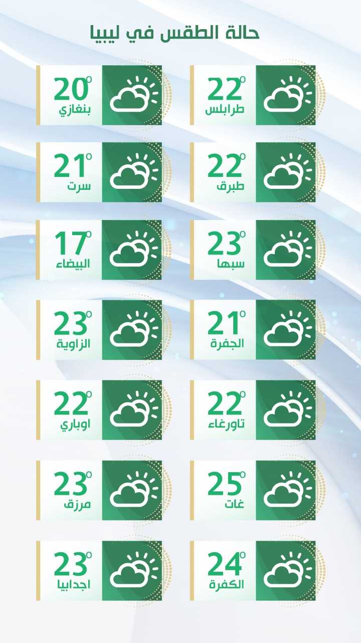 تتكاثر السحب من مساء اليوم على الساحل، مع فرصة لسقوط أمطار متفرقة خاصة على المنطقة الممتدة، من الخمس إلى سرت، وتكون الرياح شمالية إلى شمالية غربية، معتدلة السرعة، في حين تتراوح درجات الحرارة القصوى بين 20 و24 درجة مئوية.