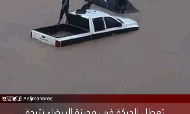 تعطلت الحركة تماما في معظم طرق وشوارع مدينة البيضاء اليوم السبت نتيجة لغرق المدينة بالمياه الناتجة عن الامطار الغزيرة وسببت خسائر مادية كبيرة .
