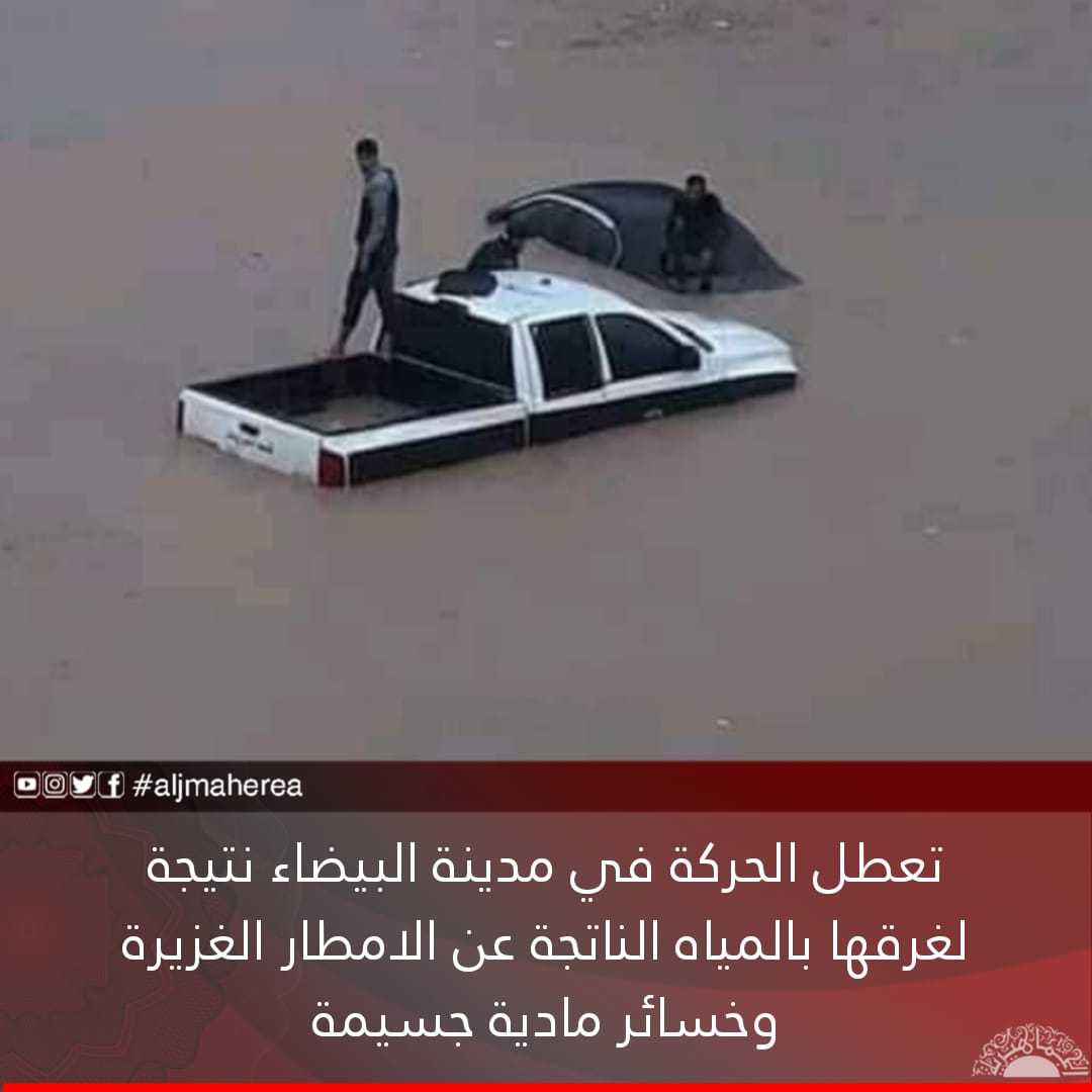 تعطل الحركة في مدينة البيضاء نتيجة لغرقها بالمياه الناتجة عن الامطار الغزيرة وخسائر مادية جسيمة