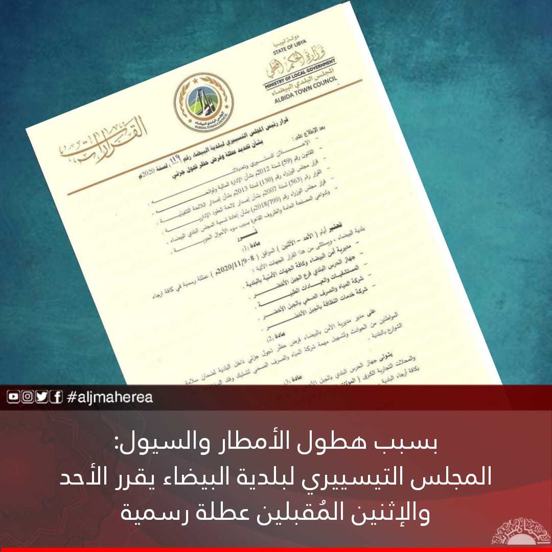 بسبب هطول الأمطار والسيول: المجلس التيسييري لبلدية البيضاء يقرر الأحد والإثنين المُقبلين عطلة رسمية
