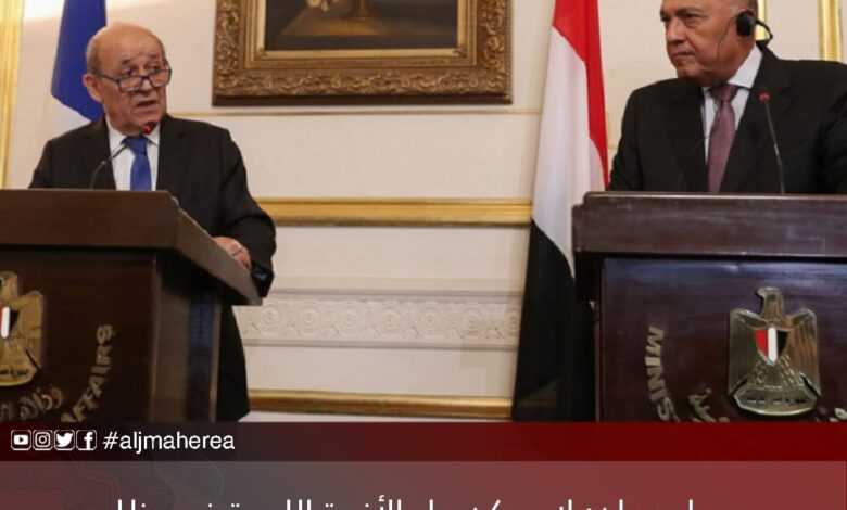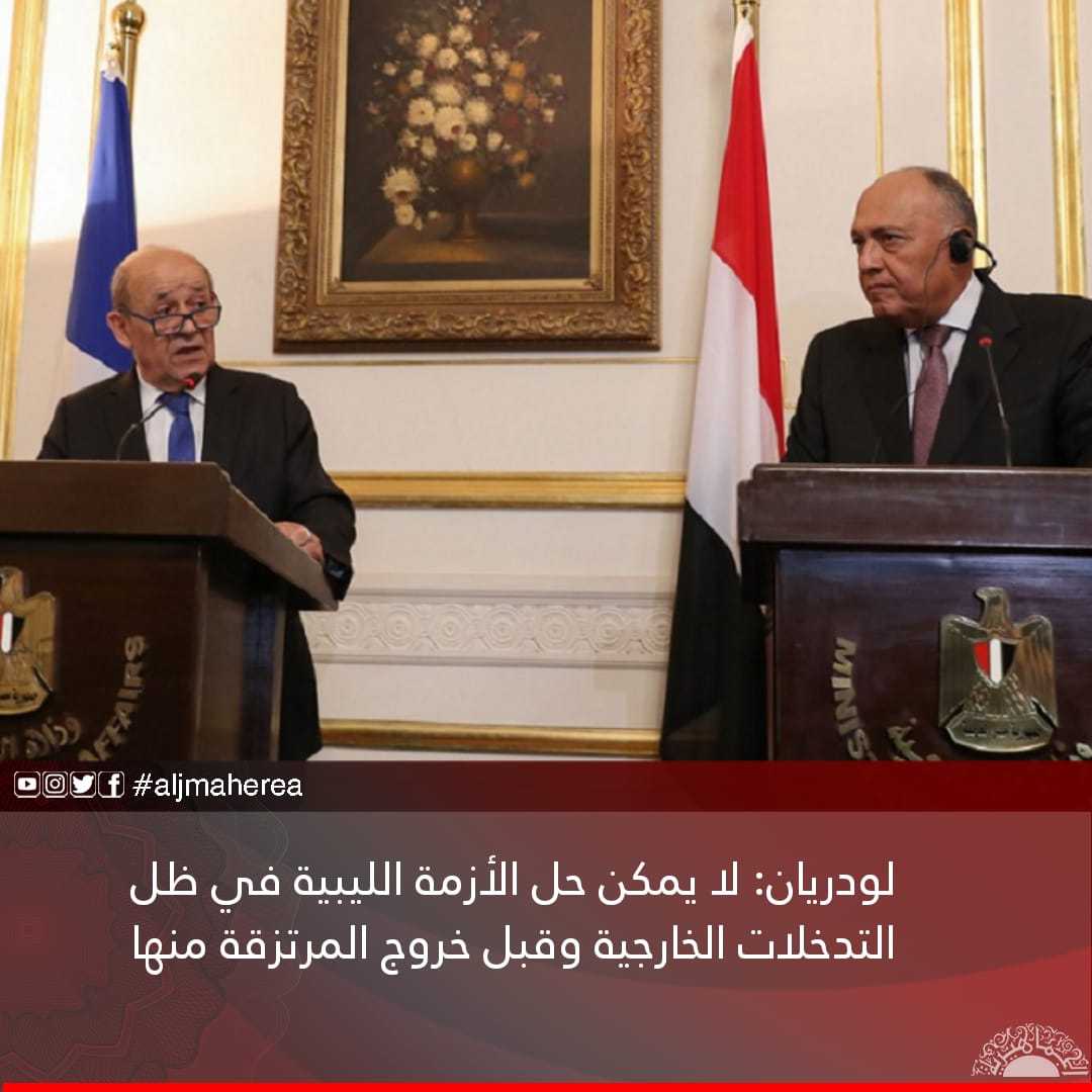 وأضاف لودريان خلال مؤتمر صحفي جمعه بنظيره المصري سامح شكري، أن المحادثات بينهما تناولت الأزمات الإقليمية والتي منها ليبيا في المقام الأول.